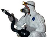 ATTIC CLEANUP AND DECON: Rats leave an attic full of droppings and even parasites. They also leave behind a strong pheromone scent in their urine and fur oils. This scent attracts new rats and other wildlife to your home and attic. After we get rid of all of your rats, we clean up the mess and odor that they've left behind. We kill the parasites and pathogens, eliminating the health risk. We also deodorize the attic. We use a special enzyme-based cleaner that destroys all organic matter, such as poop, urine, and grease. To the right is a photo of me in my biohazard suit with atomizing fogger machine.